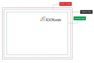Basılacak çalışma için tasarımınızı hazırlarken dikkat etmeniz gereken önemli hususlardan biri kesim ve taşma çizgileridir. Kesim çizgisi kesilecek olan alanı göstermektedir. Tasarımınızı asla kesim çizgisine yakın yapmamalısınız. Tasarımınızın en az 3 mm içerde güvenli alanda olduğundan emin olmalısınız. Eğer kesim çizgisinin dibinde tasarımınıza ait obje, yazı, çizgi vb. bir öge var ise kesilme ihtimali oldukça yüksektir. Taşma payı ürünler kesilirken kenarlarında beyaz alan kalmaması için bırakılan alandır. Tasarımda zemin rengi kullandıysanız ya da zeminde devam eden görseller var ise mutlaka bu alana tamamen yayılmalıdır. Tasarımda kesim sonrası beyaz alanların kalmaması için bu yapılması gereken önemli bir işlemdir. Güvenli alan kesim çizgisinden yaklaşık 5 mm içerde olan ve tasarımınızın yer alacağı güvenli bölgedir. Tasarımınızdaki objelerin kesilmemesi için çalışmanızı mutlaka güvenli alan içinde yapmaya özen göstermelisiniz.